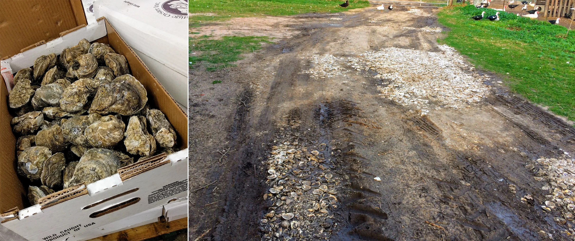 We were thrilled when Munkebo Farm joined the conversation and brought a new reuse idea to the table – to use these shells as road base. Munkebo Farm picked up 3,000lbs of oyster shells from Quality Seafood to use on their farm’s road, which saved on costs for both parties, diverted around .7 tons of CO2 emissions, and created a road made of natural materials that won’t leach harmful chemicals into the surrounding environment.